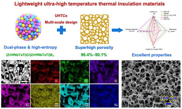 Researchers led by Professor Jingyang Wang at the Institute of Metal Research, Chinese Academy of Sciences, have pioneered a multiscale collaborative design approach that combines the high-entropy effect with a highly porous structure. Their innovation: a porous dual-phase high-entropy ultrahigh-temperature ceramic composed of (TiZrHfNbTa)C–(TiZrHfNbTa)B2.