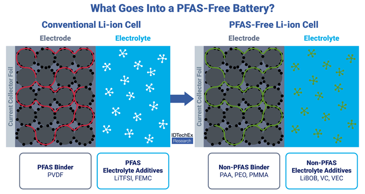 Keywords: PFAS-free batteries, lithium-ion batteries, PFAS alternatives, sustainable energy storage, battery additives, non-PFAS binders, non-PFAS electrolytes, IDTechEx report, EV batteries, environmental materials science